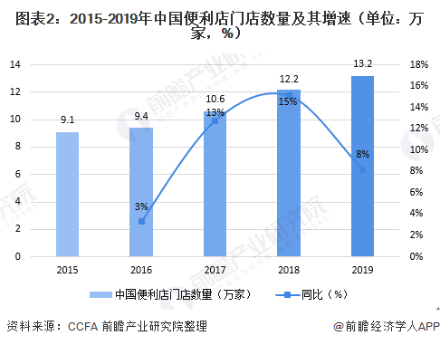 根据中国连锁经营协会(CCFA)公布的数据显示,2019年中国便利店门店数量达13.2万家,同比增长9%,门店增速有所放缓。