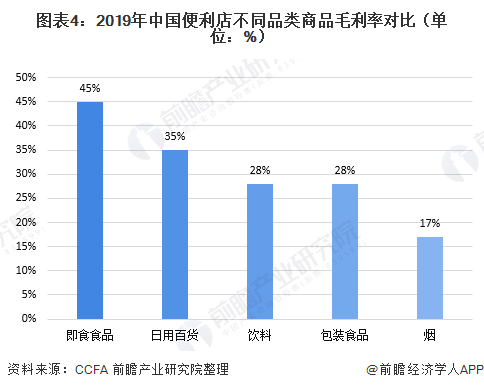 根据中国连锁经营协会(CCFA)公布的调研数据显示,2019年中国便利店各品类产品毛利率差异较大,其中即食食品的毛利率达45%远高于其他品类。