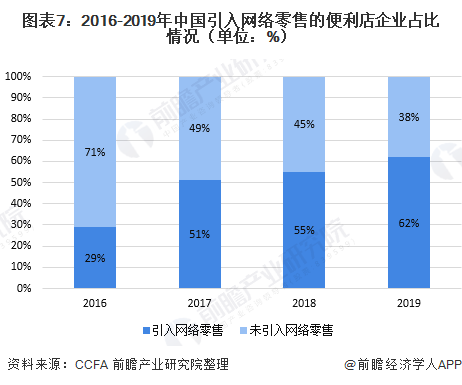 在电子商务和移动支付的推动下,我国便利店也逐渐引入网络零售,支持移动支付方式以适应消费者的消费习惯。根据CCFA公布的调查数据显示,近年来,引入网络零售的便利店比重快速增长,2019年有62%的便利店引入网络零售,同时有89%的便利店移动支付金额比重超过30%。