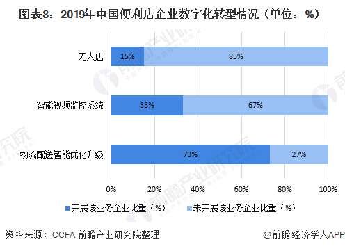 近年来,随着物联网、人工智能等信息技术的快速发展,传统便利店在技术的支持下开始进行数字化转型以提高门店的运营能力和经营效率。根据CCFA公布的调查数据显示,有73%的企业投资了物流配送的智能优化升级,以优化供应链管理;33%的便利店企业采用了智能视频监控系统,有15%的便利店企业开展了无人店试点。