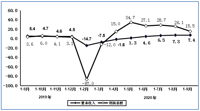 图2 2019年9月以来电子信息制造业营业收入、利润增速变动情况(%)