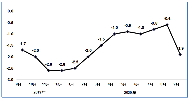 图3 2019年9月以来电子信息制造业PPI分月增速(%)