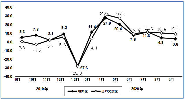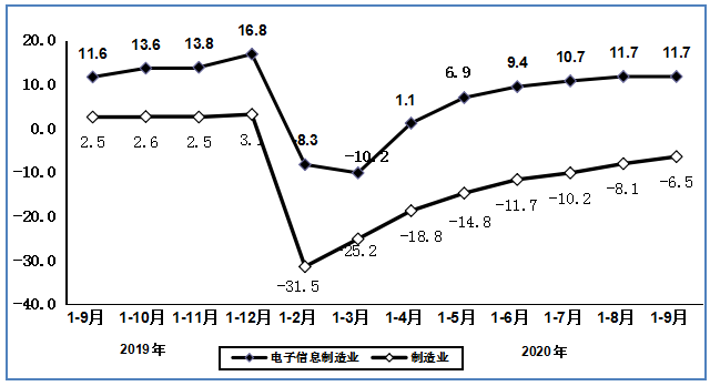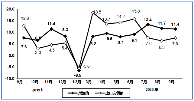 图1 2019年9月以来电子信息制造业增加值和出口交货值分月增速(%)
