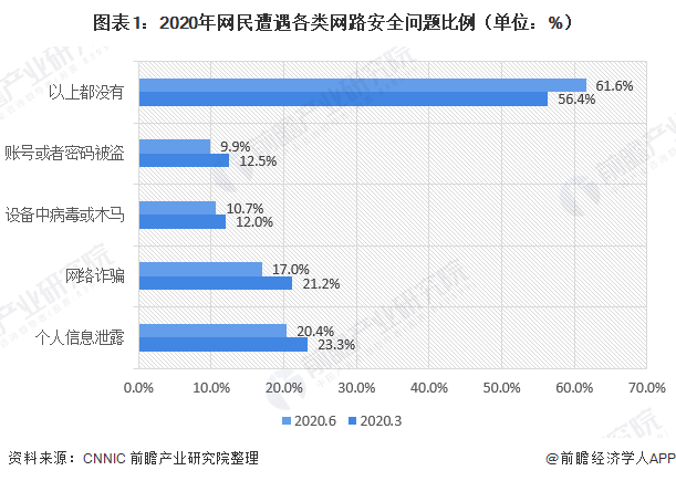 截至2020年6月,61.6%的网民表示过去半年在上网过程中未遭遇过网络安全问题,较2020年3月提升5.2个百分点。网民遭遇各类网络安全问题的比例均有所下降。其中,遭遇网络诈骗的网民比例较2020年3月下降明显,达4.2个百分点;遭遇个人信息泄露的网民比例也较2020年3月下降2.9个百分点。