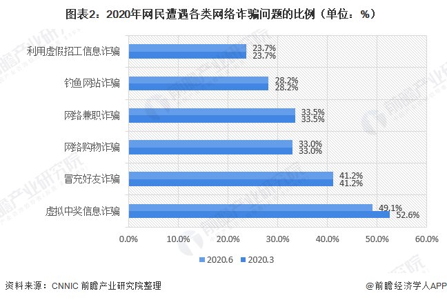 通过对遭遇网络诈骗网民的进一步调查发现:虚拟中奖信息诈骗仍是网民最常遭遇的网络诈骗类型,占比为49.1%,较2020年3月下降3.5个百分点;冒充好友诈骗的占比为36.0%,较2020年3月下降5.1个百分点;网络购物诈骗的占比为31.8%,较2020年3月下降1.2个百分点。