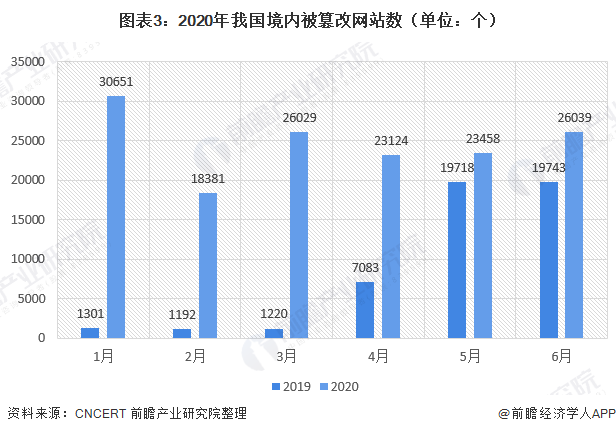 2020年上半年,国家计算机网络应急技术处理协调中心(中文简称国家互联网应急中心,英文简称CNCERT)监测发现我国境内被篡改l网站数量为147682个132,较2019年同期(50257个)增长较大。