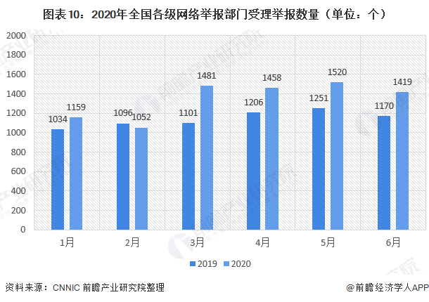 2020年上半年,全国各级网络举报部门共受理举报8088万件,较2019年同期(6858万件)增长17.9%。