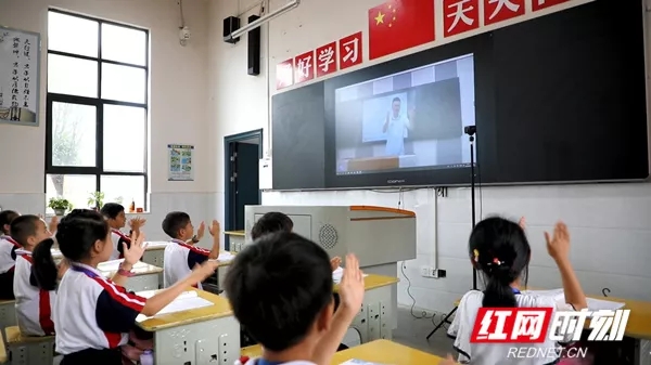 新田县是湖南省农村网络联校群建设实验县和现代教育技术实验县,图为新田县芙蓉学校三年级1班,同学们通过信息化设备,与永州市映山小学的同学们同步聆听音乐老师的讲课。图片来源:红网