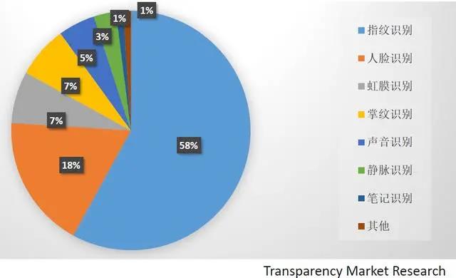 但是从上面成本、便捷程度、接受度来看,指纹识别和人脸识别确实是普及生物识别最好的方式,并且现在两者在市场份额上来看,也是名副其实。根据Transparency Market最新的数据显示,指纹识别在所有生物识别占比58%,人脸识别占比18%,位列前二。
