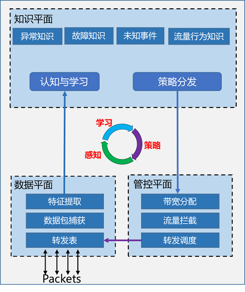 知识平面是指利用AI算法深入解析来自数据平面的特征数据,从而分析网络实体和网络应用的行为。具体来说,通过解析统计特征,可以实时观测网络动态,实现流量可视化;通过学习不同应用程序的不同模式,可以实现应用分类功能;通过学习网络实体的正常行为,偏离正常行为即检测为异常,可以实现攻击检测功能;通过分析网络实体的事件日志,可以实现故障检测功能。