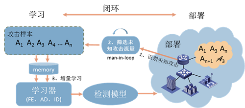 传统的基于规则和特征匹配的安全检测方法难以处理加密流量和零日攻击的检测问题。AI算法因其特有的泛化能力,基于AI的异常检测和攻击分类算法受到了广泛的研究。此外通过研究深度学习模型增量更新的能力,可以实现检测模型的自我更新,最大程度上减少分析攻击样本、提取攻击特征的人工代价。图 3展示了基于深度学习的自演进安全检测框架,通过初始样本训练的检测器,能够在部署阶段从环境中检测并收集未知攻击样本,再利用新样本更新模型,实现学习与检测的闭环。这一过程主要包括未知攻击检测和增量学习两个主要过程。