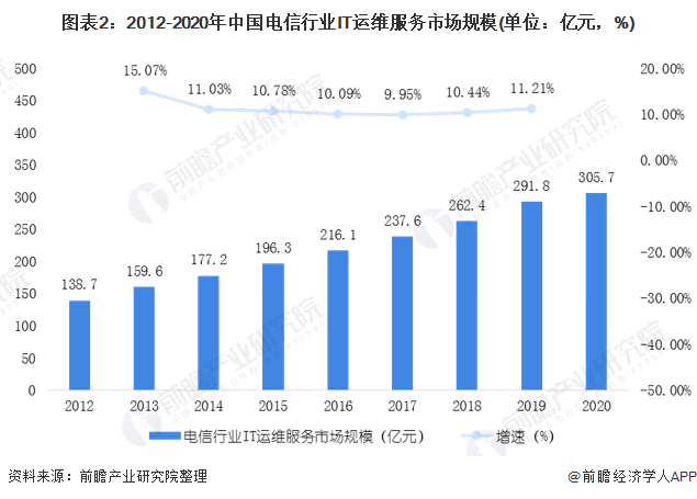 信息系统的建设是电信运营商发展的重中之重,电信行业的IT成熟度远超过其他行业。2019年,电信行业IT运维服务市场规模达到291.8亿元。根据电信行业IT运维服务市场发展近几年的情况来测算出2020年中国电信行业IT运维服务市场规模将达到305.7亿元左右。