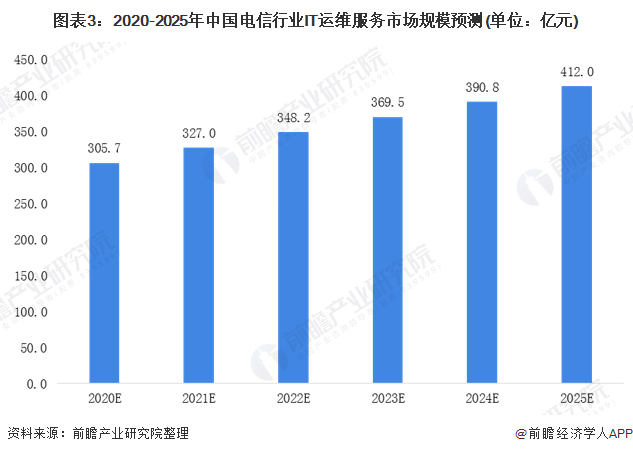 未来,电信行业的竞争势必会进一步加剧,云化和集约化比传统架构更适应运营商的业务发展需要。运营商向云化的转型将推动其对云管理平台的需求。云管理平台能够支持资源管理的动态分配和调度、应用服务监控、数据分析预警、数据库监控和日常维护的全过程,云管理平台的建设将是云化集约后运营商IT系统稳定运营的关键。此外,因为非机构化的语言记录、音频、图片和视频等数据量急剧增长,如何发挥海量非结构化数据的价值,有效服务客户和提高业务效率将是运营商下一阶段的重点课题,电信行业的发展空间将非常可观。前瞻依据过往年度电信行业IT运维服务市场的规模数据之调和平均增长率并进行一定调整的方法,进行预测,2025年电信行业IT运维服务市场规模将有望达到412亿元左右。