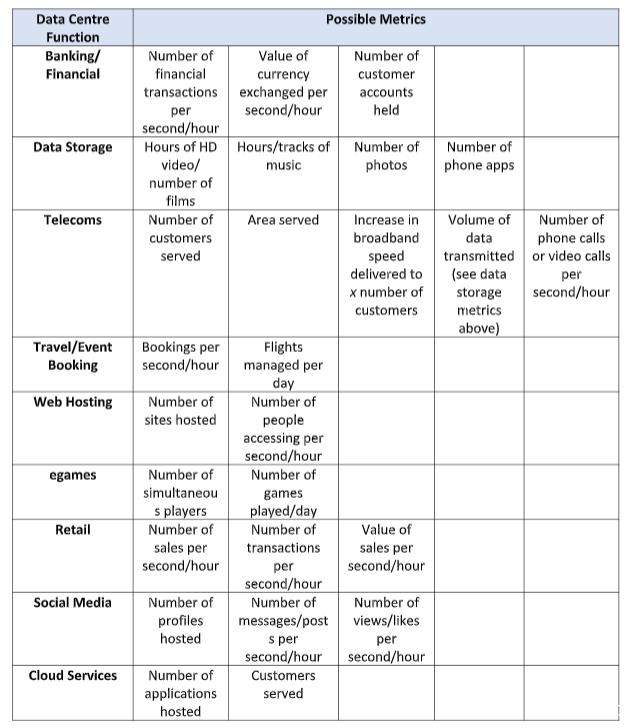 如果想表达数据中心设施的真正价值,则需要更具意义的方式采用与数据中心设施主要目标相关的指标。下表有助于说明: