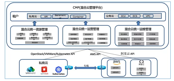 由于不同云资源池的云服务能力不相同,为了实现资源标准化服务供给,需要对齐各个云服务提供商的服务能力,因此需要构建一套统一的混合云管理平台。需要从三个维度进行设计:统一的资源管理层;统一的运营管理层、统一的运维管理层。其中资源管理层可以实现多个云资源提供商的资源纳管,同时针对一些有差异化的服务进行抽象提取出其共性。统一运营管理偏重于混合云的成本管理、用户体系管理、项目管理等。统一的运维管理偏重于工单管理、事件管理、变更管理等。
