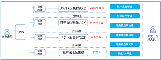 使用混合云的最终场景,是可以实现应用在多个云平台上进行流量均衡及迁移,这样实现资源无缝迁移以及避免单一云提供商绑定。这需要在应用在多个云资源池上进行部署,同时数据库需要使用分布式数据库或者数据库集群多副本技术来确保数据一致性,再从DNS上进行流量策略的调整。