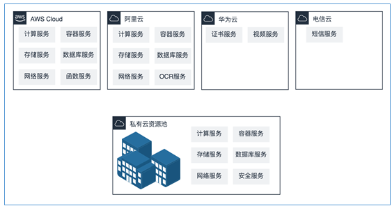 混合云是由多个云资源池组成,而每个云资源池都会有不同的特点。可以根据每个云提供商的服务先进性进行服务选择。比如,私有云资源池更偏重的是云资源的稳定性和安全性,因此可以把计算、存储、网络这些云服务使用私有云来提供;比如,阿里云的DNS解析比较好,因此可以选择阿里云来提供网络云资源;比如,AWS的容器与云适配比较好,因此可以选择AWS提供容器服务;同样可以选择华为云提供视频服务,选择电信云提供短信服务。