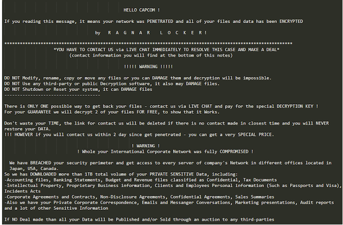 据悉,入侵Capcom的网络犯罪分子使用名为Ragnar Locker的勒索软件,声称已窃取了超过1 TB的文件,包括会计文件、银行对帐单、财务报告、税收文件、知识产权、专有业务信息、员工和客户的个人信息、公司合同、电子邮件、私人聊天以及各种其他类型的信息。