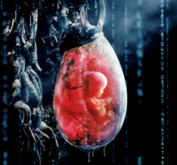 ■《黑客帝国》系列电影的海报(局部)。在这部电影中,人类像虫卵一样寄生在“母体”中,所有的经历,快乐或悲伤,都来自于“母体”制造和发出的信号。