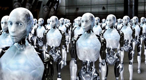 ■2004年科幻电影《机械公敌》的剧照。在这部电影中,人类采用了“让机器人来制造机器人”的技术,反叛人类、违反“机器人三定律”的机器人得以“克隆”出大批志同道合者。