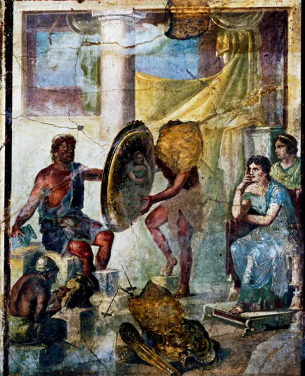 ■火神赫菲斯托斯以用金属制造出自动的人或物著称。图为出土于庞贝古城的壁画,描绘了赫菲斯托斯为海神女儿西蒂斯的儿子阿克琉斯打造盔甲和盾牌的故事。