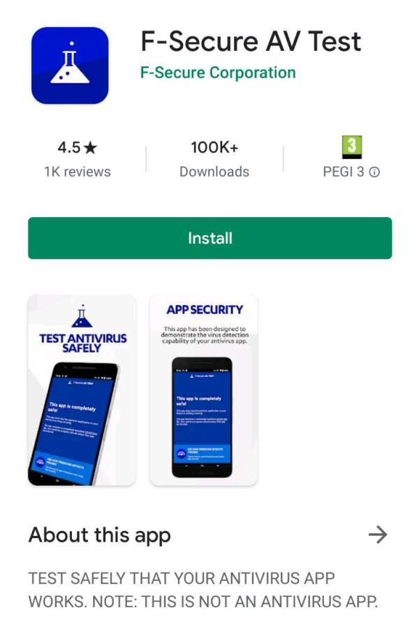 如下图所示,您可以从Google Play商店里搜索并安装F-Secure AV Test应用。如果您手机上的安全应用提供着实时保护,那么它就会持续生效,并阻止AV Test。否则,请采用手动运行扫描的方式,检测出此类伪恶意代码。