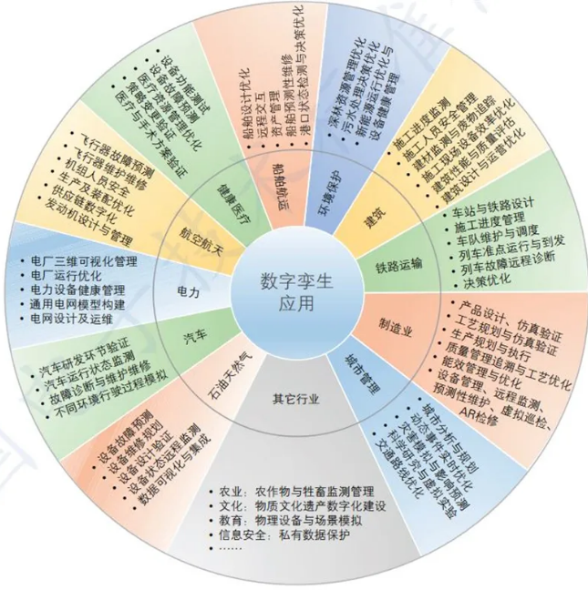 近年来,数字孪生得到越来越广泛的传播。同时,得益于物联网、大数据、云计算、人工智能等新一代信息技术的发展,数字孪生的实施已逐渐成为可能。现阶段,除了航空航天领域,数字孪生还被应用于电力、船舶、城市管理、农业、建筑、制造、石油天然气、健康医疗、环境保护等行业,如上图所示。特别是在智能制造领域,数字孪生被认为是一种实现制造信息世界与物理世界交互融合的有效手段。许多著名企业(如空客、洛克希德马丁、西门子等)与组织(如Gartner、德勤、中国科协智能制造协会)对数字孪生给予了高度重视,并且开始探索基于数字孪生的智能生产新模式。