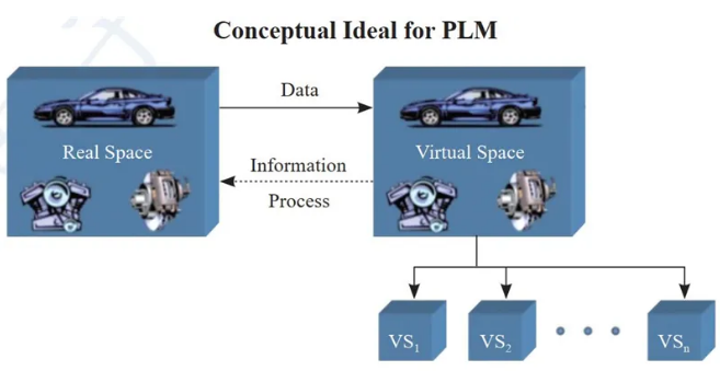 2003年前后,关于数字孪生(Digital Twin)的设想首次出现于Grieves教授在美国密歇根大学的产品全生命周期管理课程上。但是,当时“Digital Twin”一词还没有被正式提出,Grieves将这一设想称为“Conceptual Ideal for PLM(Product Lifecycle Management)”,如下图所示。尽管如此,在该设想中数字孪生的基本思想已经有所体现,即在虚拟空间构建的数字模型与物理实体交互映射,忠实地描述物理实体全生命周期的运行轨迹。