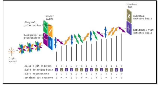 量子密钥分配的过程大致如下:单个光子通常作为偏振或相位自由度的量子比特,可以把欲传递的0,1 随机数编码到这个量子叠加态上,比如,事先约定,光子的圆偏振代表1,线偏振代表0。光源发出一个光子,甲方随机地将每个光子分别制备成圆偏振态或线偏振态,然后发给合法用户乙方,乙方接收到光子,为确认它的偏振态(即0 或1),便随机地采用圆偏光或线偏光的检偏器测量。如果检偏器的类型恰好与被测的光子偏振态一致,则测出的随机数与甲所编码的随机数必然相同,否则,乙所测得的随机数就与甲方发射的不同。乙方把甲方发射来的光子逐一测量,记录下测量的结果。然后乙方经由公开信道告诉甲方他所采用的检偏器类型。这时甲方便能知道乙方检测时哪些光子被正确地检测,哪些未被正确地检测,可能出错,于是他告诉乙方仅留下正确检测的结果作为密钥,这样双方就拥有完全一致的0,1随机数序列。