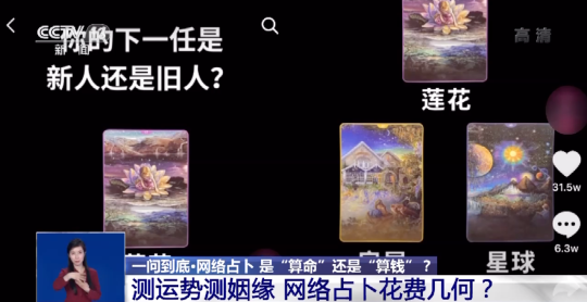 总台央视记者登录某短视频平台,以“占卜”为关键词进行搜索。结果显示,综合排名第一的是一条用塔罗牌预测未来情感走势的短视频,一共收获了31.5万个点赞,6.3万条评论,还有2.2万个转发。