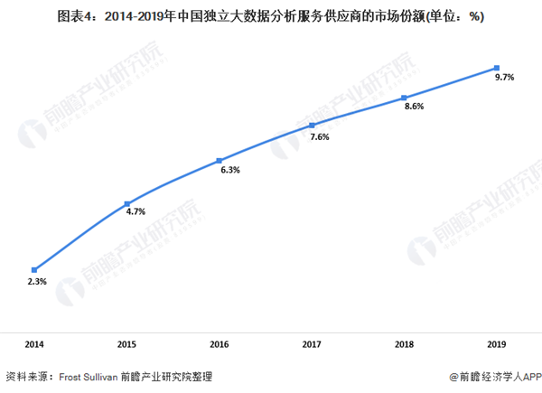 2014年起至2019年,独立大数据分析服务供应商的市场份额占金融服务业大数据分析服务供应商整体市场份额由2.3%增至9.7%。