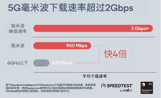 目前,毫米波的性能已经得到了验证,而随着运营商开始部署毫米波,用户已经可以享受相关服务。从用户使用Ookla进行测速的数据中可以看到,毫米波峰值速率超过2Gbps,平均下载速率达到6GHz以下频段的4倍。