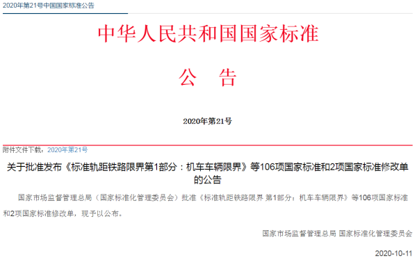 根据2020年第21号中国国家标准公告,国家市场监督管理总局(国家标准化管理委员会)近日批准发布了《标准轨距铁路限界第1部分:机车车辆限界》等106项国家标准和2项国家标准修改单。其中包括《物联网智能家居用户界面描述方法》(GB/T39189-2020)、《物联网智能家居设计内容及要求》(GB/T39190-2020)。