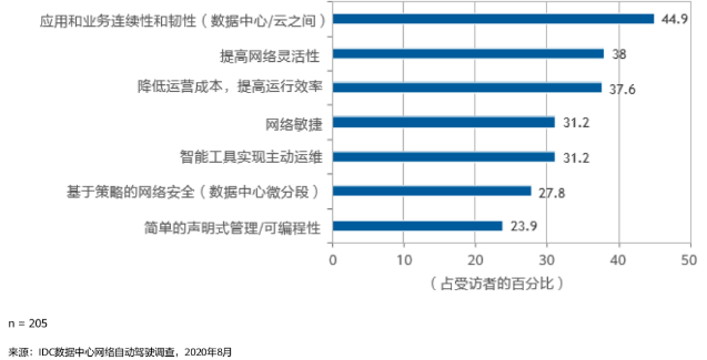 ”对数据中心网络自动化需求驱动因素的调查,也验证了这一观点。大约45%的受访者选择应用和业务的连续性和韧性(数据中心/云之间)作为首要因素。IDC认为,COVID-19疫情推动了此结果。各组织将业务弹性和连续性放在首位,因为它们专注于在不可预见的危机中保持组织持续运行。