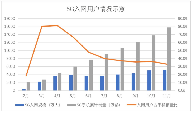 若剔除以上因素,整体判断:2020年5G手机的增长远大于入网用户情况,且5G入网用户并未随手机销量增加而提高渗透率,甚至在11月渗透率还有下行的压力。