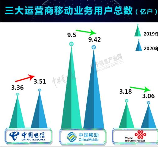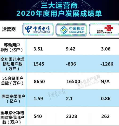 2020年全年,中国移动用户累计净减835.9万,中国联通累计净减1266.4万,而中国电信则是净增1545万,成为2020年唯一实现正增长的运营商。中国电信在2019年的业绩报告中指出,目标2020年实现移动用户数净增1500万户,从数据来看,已完成全年目标。