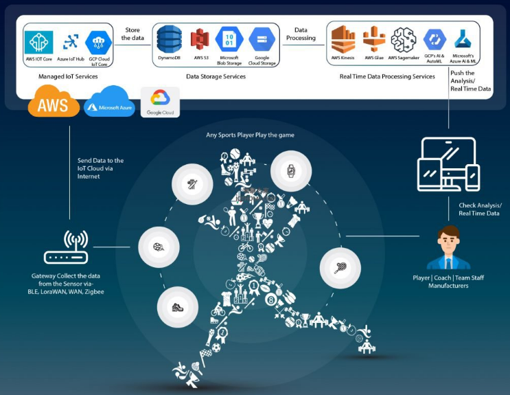 传感器集成和使用网关传输数据:如图所示,传感器芯片(如加速度、运动)与接触设备(如板球球棒、棒球球棒、球拍等)集成在一起。可根据其中应用的智能来检测各种事件。传感器收集到数据后,便会使用无线传输技术(例如蓝牙、LoRaWAN、Zigbee)将数据传输到最近的网关。