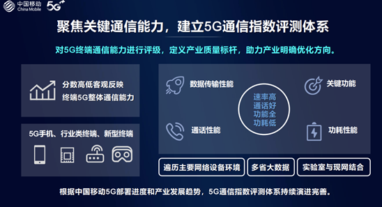 中国移动《报告》的发布,刚好填补了这方空白,凭借严谨的5G通信指数评测体系对5G终端进行评级,简单明了地向公众展示当前5G手机的实际能力,为用户购机提供专业参考。