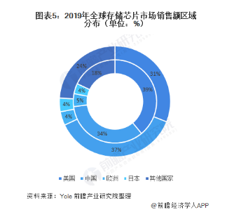 从存储芯片细分产品来看,目前DRAM和NAND Flash占据了存储芯片95%以上的市场份额。从细分产品市场销售区域格局来看,美国和中国是全球存储芯片的重要市场。2019年,中国购买了全球34%的DRAM芯片,排名全球第二,仅次于美国的39%。得益于智能手机的发展,中国地区对NAND闪存的需求规模占比全球最大,根据Yole的数据,2019年中国地区NAND闪存市场销售额占全球37%,其次是美国的31%。