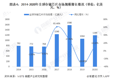 近年来,存储芯片行业迎来爆发,2014-2018年市场规模逐年上升,2019年出现下滑。根据世界半导体贸易统计协会(WSTS)统计,2019年全球半导体市场规模为4123.07亿美元,其中存储芯片市场规模为1064亿美元。2020年12月1日,WSTS发布了最新半导体市场预测,预计2020年全球半导体市场将达到4331亿美元。其中除了光电和分立器件,增长最大的是存储芯片,2020全年市场规模预计达到1194亿美元。