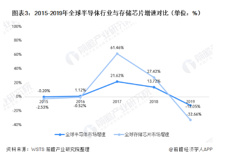 从市场规模增速来看,全球半导体市场规模增速与存储芯片增速走势基本一致,2017年后,二者增速均明显下降,2019年全球半导体市场增速为-12.05%,存储芯片市场增速为-32.66%,说明存储芯片和半导体行业均呈现下行。