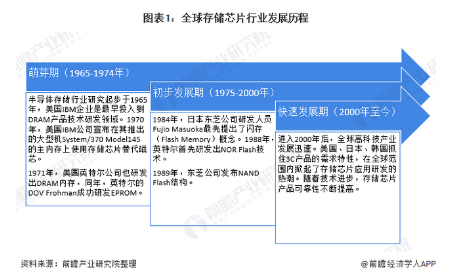 全球存储芯片行业发展至今可分为萌芽期、初步发展期、快速发展期三个阶段。1)萌芽期:在此阶段,各大企业都在积极研发RAM,且DRAM研究进展比ROM快,行业实现了从DRAM的研发到DRAM的应用,为行业后续的DRAM规模化应用奠定了基础。2)初步发展期:日本凭借领先的DRAM技术,推动日本DRAM产品在全球市占率不断提升;行业多元化发展,存储芯片产品逐渐多样化。3)快速发展期:目前存储芯片不仅用于各种计算机和服务器中,同时也是磁盘阵列和各网络存储系统中基本的存储单元。