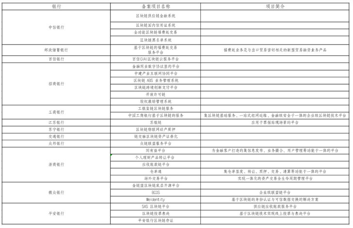 在整体的梳理过程中可以发现,所有涉及金融的备案项目中,基本涵盖的是供应链金融、数字资产、ABS、支付、中小企业融资服务、金融监管、福费廷交易、跨境贸易、保险理赔、大宗商品交易服务、金融资产交易服务等场景。
