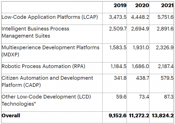 根据Gartner最新预测,到2021年全球低代码开发技术市场总额将达到138亿美元,比2020年增长22.6%。