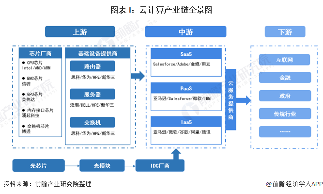 云计算产业链的核心是云服务厂商,海内外主要的厂商有亚马逊、微软、谷歌、Facebook、苹果、阿里、腾讯等互联网转型企业,提供弹性计算、网络、存储、应用等服务。互联网数据中心(IDC)厂商为之提供基础的机房、设备、水电等资源。