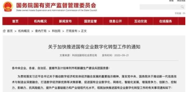 2020年9月,国家印发了《关于加快推进国有企业数字化转型工作的通知》,系统且明确指出国有企业数字化转型的基础、方向、重点和举措。未来,企业数字化转型已成全国各省市重点工作部署之一。