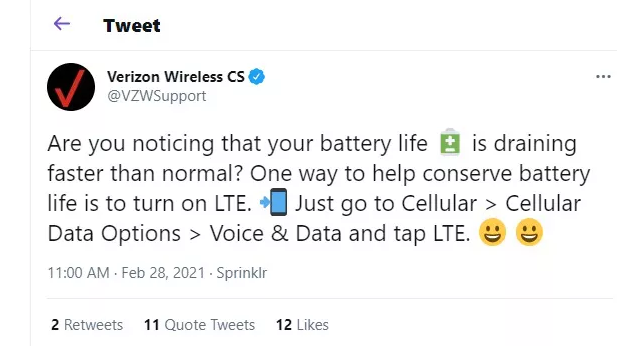 推文中表示,如果用户发现手机电量比正常情况下消耗得更快,可以打开手机LTE(Long Term Evolution)来减轻耗电情况。当然,开启LTE就意味着要关闭手机的5G网络功能,Verizon这样的说法总比直接告诉用户“关掉5G”来的委婉一些。