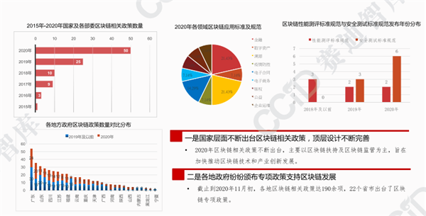 截止到2020年11月,国家层面共有50项区块链政策信息公布,主要围绕区块链监管、区块链扶持、区块链产业应用展开。各地区块链相关政策达190余项,广东省、山东省、北京市等22个省市出台了区块链专项政策,同比2019年大幅增加,主要以积极推动区块链与大数据、人工智能等信息技术的融合,监管、鼓励供应链、金融等领域应用为主。纵观全球,各国的区块链相关法案,也主要集中在推动创新、加强监管、区块链采用等鼓励发展等层面。