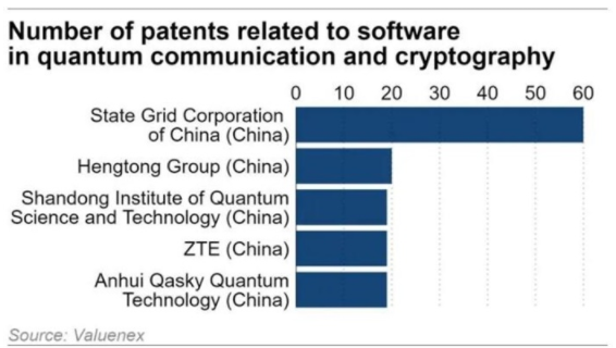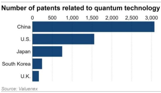根据Valuenex对量子技术相关专利的分析,中国在这个领域拥有多达3000项量子专利,总数约为美国的两倍。