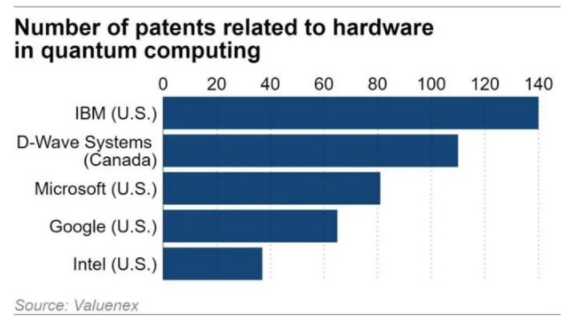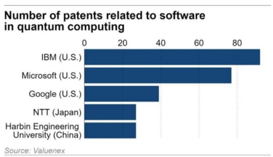 美国在量子技术上领先的主要是量子计算硬件及软件:IBM以140项量子计算机硬件专利成为量子技术领域的领先者。微软以81项专利排名第三,谷歌以65项专利排名第四。在软件技术方面,美国也领先于其他国家。